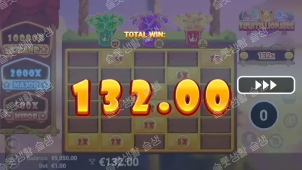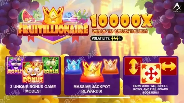 프루틸리어네어(Fruitillionaire)는 분노한 과일들이라는 우스꽝스럽고 코믹한 테마 뒤에 강력한 3-Pot 홀드 앤 윈 엔진을 숨겨둔 매력적인 슬롯입니다. 베이스 게임은 다소 밋밋하지만, 3가지 항아리 능력이 겹쳐서 터지는 5x6 확장 보너스 라운드의 위력은 10,000배 맥스윈을 향한 확실한 원동력이 됩니다. 특히 150배를 지불하고 3기능 확정 보너스를 구매하는 옵션은 하이 리스크 플레이어들에게 효율적인 도전 기회를 제공합니다. 복잡한 룰 없이 수집형 홀드 앤 윈 메커니즘의 직관적인 타격감을 선호하는 유저들에게 추천할 만한 웰메이드 타이틀입니다.