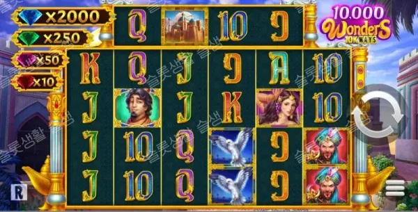 릴플레이(ReelPlay)가 화려한 중동의 건축물과 신비로운 아라비안 테마를 배경으로 한 10,000 원더스 빅뱅을 출시했습니다. 유명한 '10,000 웨이즈(Ways)' 시리즈의 일환으로 4-5-5-5-5-4 비대칭 구조의 6릴 그리드를 사용하여 만 개의 당첨 경로를 제공합니다. 연쇄적으로 터지는 캐스케이딩(Cascading) 릴 시스템을 기반으로 하며, 슈팅 게임 형태의 독특한 '빅뱅 보너스'와 정통 홀드 앤 윈 방식의 '보너스 리스핀'이라는 두 가지 강력한 무기를 장착한 고변동성(High Volatility) 슬롯입니다.