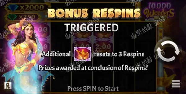 A. 3회의 리스핀이 주어지는 홀드 앤 윈 방식입니다. 새로운 램프를 수집할 때마다 카운트가 초기화되며, 현금 상금이나 4종류의 다이아몬드(최대 2,000배) 잭팟을 획득할 수 있습니다.