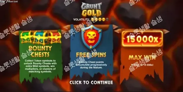 불샤크 게임즈(Bull Shark Games)가 보물을 탐하는 오크들이 지배하는 거친 판타지 전장, 그런트 골드(Grunt Gold)를 선보입니다. 6x4 그리드와 4,096 웨이즈(Ways)의 넓은 페이라인을 기반으로 하는 이 슬롯은, 연쇄 폭발하는 캐스케이딩(Cascading) 릴과 포인트를 모아 능력을 해금하는 3가지 '현상금 상자(Bounty Chests)' 메커니즘을 핵심으로 합니다. 강력한 수집형 엔진과 15,000배의 압도적인 최대 당첨금을 장착한 고변동성(High Volatility) 어드벤처 슬롯입니다.