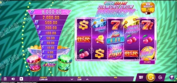 - 기능 버튼 패널: 화면 상의 '윈 부스터(Win Booster)' 버튼을 눌러 스캐터 확률업 안테벳을 활성화할 수 있습니다.