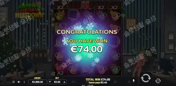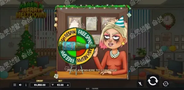1. 독창적이고 유쾌한 테마: 진상 고객 '캐런'과 망가진 연말 파티라는 인터넷 밈을 활용한 블랙 코미디 연출이 일품임. 2. 매력적인 듀얼 보너스: 스핀 횟수 연장형 프리 스핀과 잭팟 증폭형 캐시 리스핀 중 취향껏 선택할 수 있음. 3. 합리적인 옵션 비용: 보너스 진입 구매 비용이 75배로 저렴하여 부담 없이 10,000배 잭팟에 도전할 수 있음. |