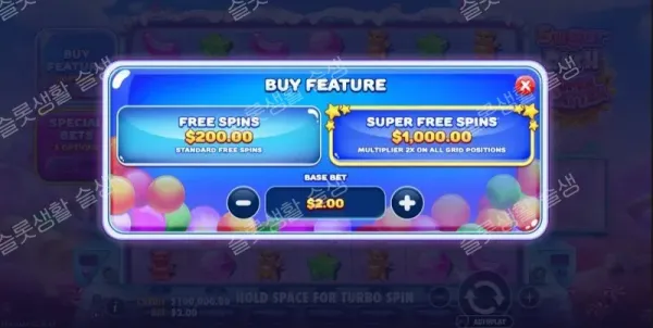 | 슈퍼 스핀 2 (Super Spin 2) | 5000x (기본 250배) | 그리드의 모든 칸(49칸 전체)에 시작부터 최소 x32 이상의 승수 장판이 깔린 채로 스핀을 1회 진행하는 초고위험 옵션입니다. |