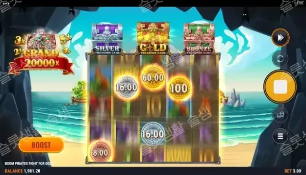 5번 릴에 붐 컬렉트 심볼이 등장하면 화면에 있는 모든 해적 코인의 가치를 합산하여 즉시 상금으로 지급합니다. 이때 1x에서 최대 5x의 배수가 무작위로 적용되어 상금의 크기를 극대화합니다.