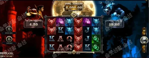 베이스 게임 중 무작위로 릴 위에 2x 또는 3x의 '달빛 승수(Moonlight Multiplier)' 기호가 뿌려져 당첨 라인의 상금을 배가시킵니다. 또한 '팽 앤 포춘 기능'이 랜덤하게 발동하면, 두 괴물이 화면에 나타나 격돌하며 즉석 현금 상금과 괴물 승수를 부여하여 당첨금을 보완합니다.
