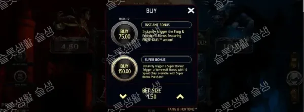 | 슈퍼 보너스 (Super Bonus) | 100x | 100배를 지불하여, 7회가 아닌 10회의 스핀이 주어지는 '늑대인간 보너스(3x 고정 승수)'로 확정 진입합니다. (※ 베팅 금액이 특정 임계치를 넘으면 기능 구매가 비활성화될 수 있습니다.) |