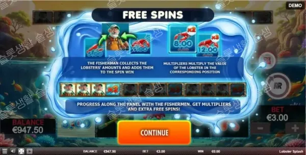 프리 스핀은 전용 릴 세트에서 진행되며, 시작 시 2개의 영구 승수 주머니(Multiplier pockets)가 이미 활성화된 상태로 제공됩니다. 랍스터가 이 주머니에 떨어지면 가치가 곱해지며, 화면에 낚시꾼 기호가 나타나면 그 즉시 릴에 있는 모든 랍스터의 현금 가치를 쓸어 담아(Collect) 상금으로 지급합니다. 매 스핀 종료 후 승수 그리드가 체계적으로 확장되거나 강화되어 후반부일수록 폭발력이 커집니다.