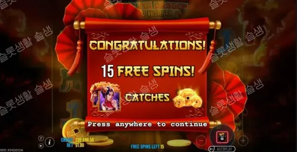 베이스 게임에서 3, 4, 5개의 스캐터 기호가 랜딩되면 각각 15회, 20회, 25회의 프리 스핀이 트리거됩니다. 만약 스캐터가 2개만 랜딩될 경우, 무작위 확률로 리스핀이나 종이 등불 애니메이션이 개입하여 3번째 스캐터를 억지로 끌어와 주는 구제 기능이 존재합니다.