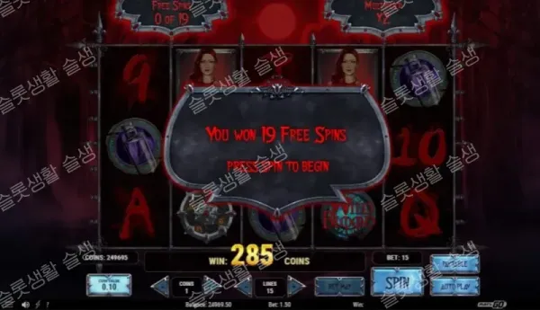 A. 3번 릴에 남자 뱀파이어 기호가 떨어지면 전체 릴로 확장됩니다. 이 상태에서 2번과 4번 릴에 각각 메달리온(Medallion) 기호가 동시에 떨어지면 확장 와일드가 고정된 채로 리스핀 시퀀스가 시작됩니다.