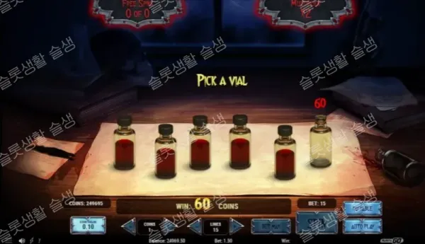 베이스 게임 중 홀수 릴인 1, 3, 5번 릴에 '피가 담긴 병' 보너스 기호 3개가 랜딩되면 미니 게임이 시작됩니다. 화면에 나타난 혈액 병들을 하나씩 선택하여 최대 30회의 프리 스핀 또는 총 베팅액의 최대 150배 현금 상금을 찾아냅니다. 단, 선택한 혈액이 불안정하여 폭발하면 보너스 픽 게임이 즉시 종료됩니다.