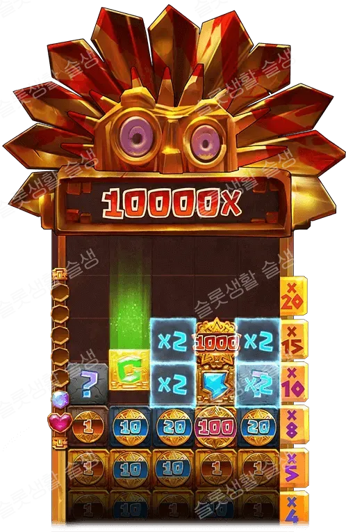• 행 채우기: 한 줄을 가득 채우면 드롭 횟수가 6회로 초기화되며, 채워진 행의 수에 따라 멀티플라이어가 최대 20배(20x)까지 상승합니다.