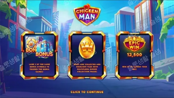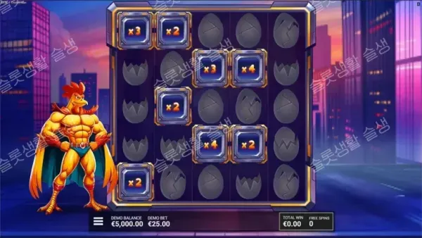 도심의 범죄를 소탕하는 깃털 달린 슈퍼히어로가 나타났습니다! 백세트 게이밍(Backseat Gaming)이 선보인 치킨 맨은 슈퍼맨을 오마주한 위트 있는 캐릭터와 박진감 넘치는 액션을 담은 슬롯입니다. 5x5 그리드 위에서 펼쳐지는 '에그벤저스'의 활약과 강력한 에그스플로전 보너스를 통해 최대 12,500배의 정의로운 승리를 쟁취하세요.