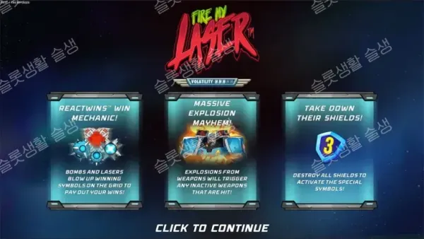 프리 스핀 스캐터와 배수 심볼은 강력한 '쉴드'에 보호되어 있습니다. 레이저나 폭탄으로 정해진 횟수만큼 타격하여 쉴드를 부수면 최대 500배(500x)의 멀티플라이어를 해제할 수 있습니다. 쉴드를 부수는 긴장감이 이 게임의 가장 큰 묘미입니다.